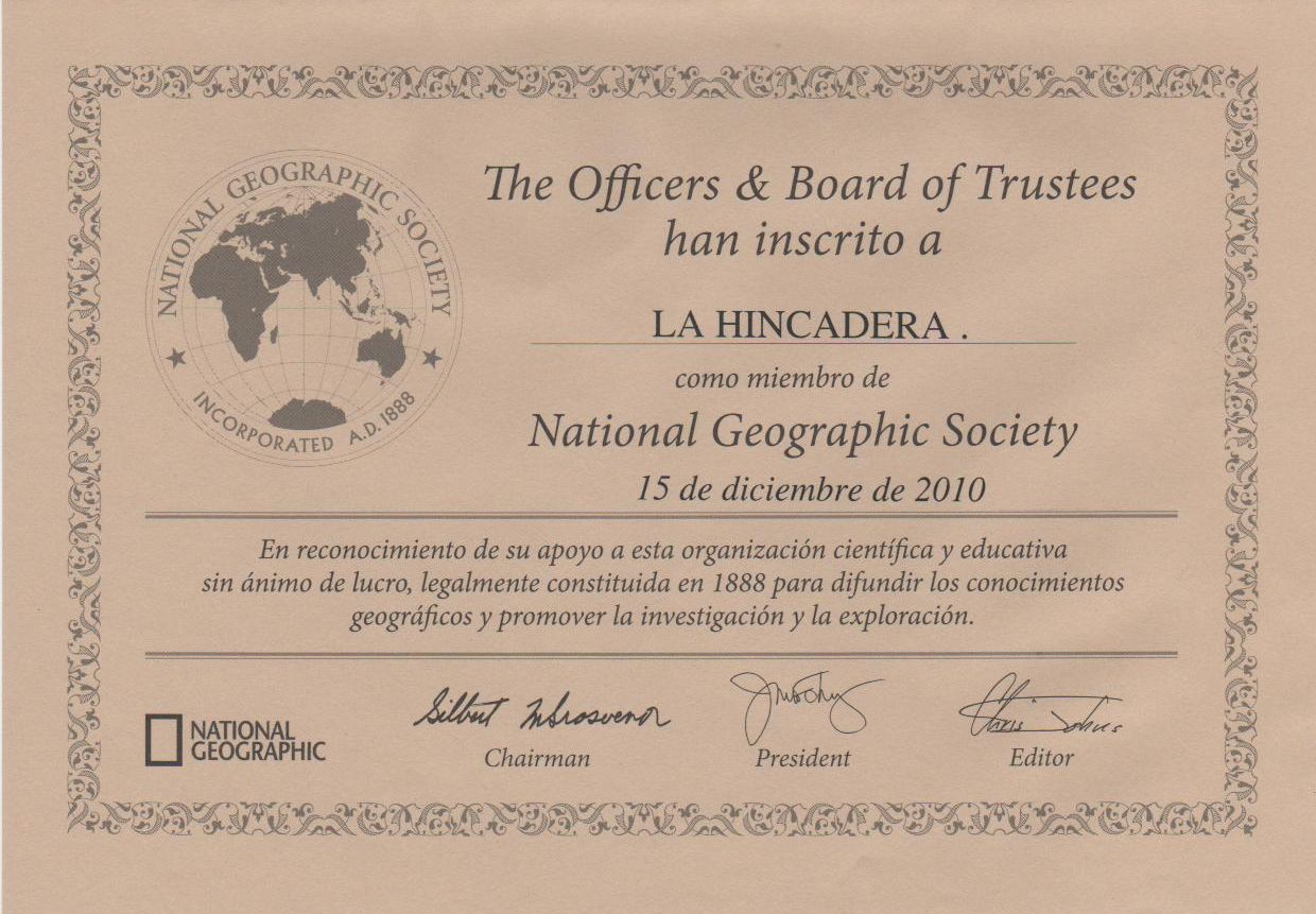 - National Geographic Society. De la que la Hincadera se enorgullece de ser socia desde 2010.