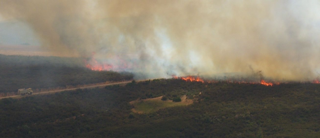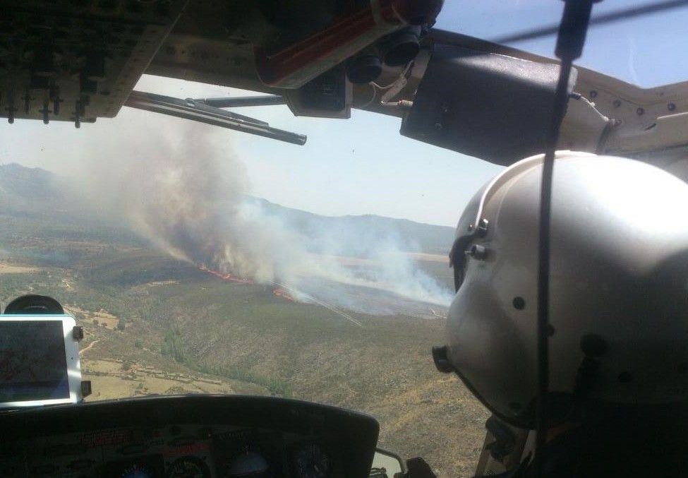 Justo a mediodía acudieron los dos helicópteros, un Bell 414 y un Kamov de la base de Robledo de Corpes así como las avionetas AirTractor y comenzaron a hacer descargas reteniendo el incendio junto a la carretera que atraviesa la planicie, en ese momento llegan varios camiones autobomba y nuevos retenes a esa carretera así como los helicópteros del BRIF de Lubia y por un momento el fuego parece perder intensidad.